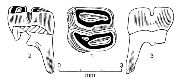 FIGURE 2. Line drawings of the holotype (NMNS-PV 20153; left m1) of Megapeomys repenningi. 1 occlusal, 2 buccal, and 3 lingual views.