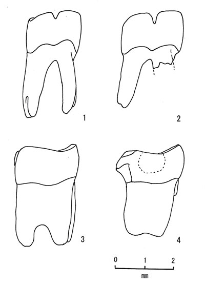 FIGURE 3. Comparison between Megapeomys lavocati and M. repenningi. 1 and 3, m1 of M. lavocati; 2 and 4, m1 of M. repenningi. 1 and 2, lingual and 3 and 4, distal views. Dashed pattern on 4 indicates the interdental wear facet.
