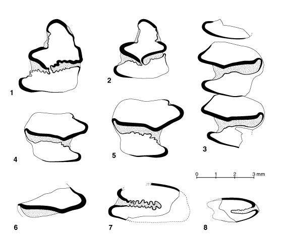 FIGURE 3. Camera lucida drawings of Alilepus elongatus, sp. nov. 1, GSP 50951, holotype, right p3 (reversed), from Y921. 2, GSP 34504, left p3, from DP13. 3, GSP 52500, left p4 (fragment), m1, m2, from Y456. 4, GSP 34508, right m1, from DP13. 5, GSP 50952, right m1, from Y921. 6, GSP 39389, right mX, from Y921. 7, GSP 50953, left P3 or P4, from Y921. 8, GSP 53241, right M1 or M2, from Y975.
