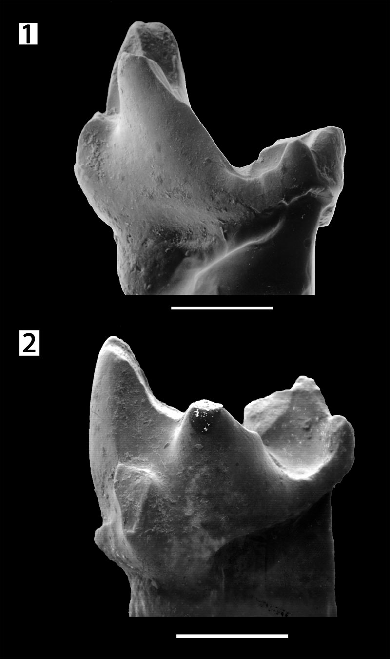 FIGURE 10. Type 3 tooth (Patterson, 1956), right lower molar, PM 922; 10.1) medial view, 10.2) oblique posteromedial view of occlusal surface. Scale bars equals 0.5 mm; SEMs courtesy of Dr. W. Turnbull.