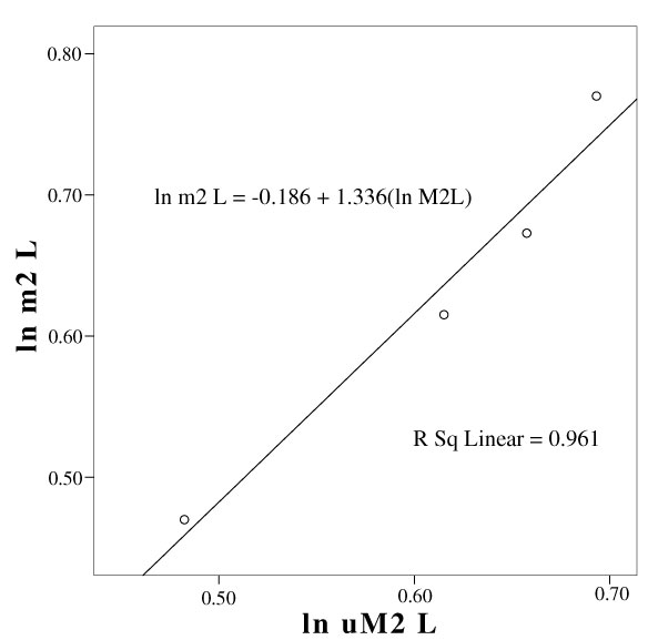 FIGURE 7. Scatter plot with regression model of ln lower m2 length versus ln upper M2 length using associated dentitions of Asian Cretaceous mammals.