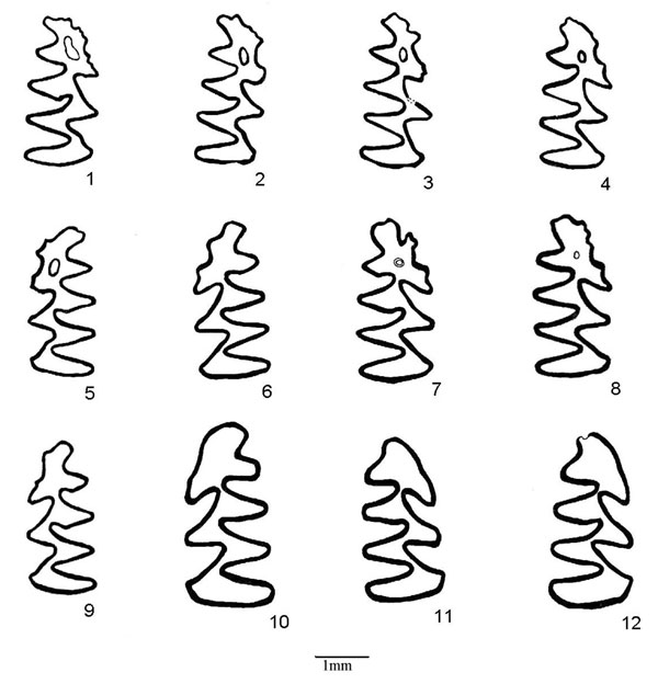 FIGURE 14. The first lower molars of Mimomys panacaensis from the Panaca local fauna. 1-12: occlusal views of m1s from Locality 9702. UALP 22470, 22473, 22472, 22455, 22471, 22405, 22466, 22404, 22467, 22412, 22408, and 22413.