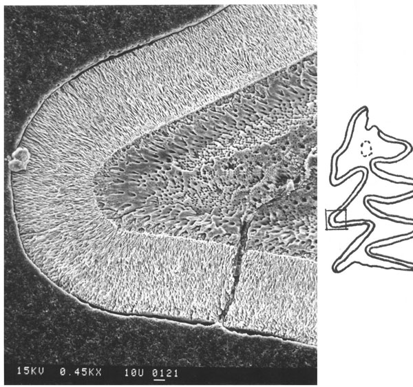FIGURE 16. Schmelzmuster of Mimomys panacaensis on the alternating Triangle 2 of the same specimen as Figure 15. The leading edge is composed of a radial enamel layer and a discrete lamellar enamel layer. The trailing edge is composed of a radial enamel layer and a primitive tangential enamel layer.
