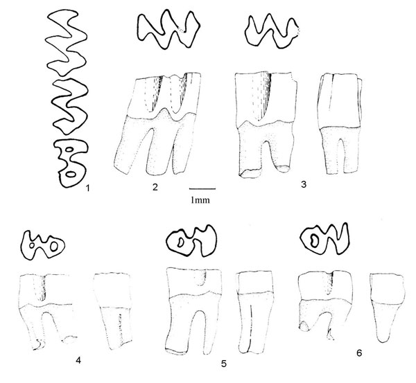 FIGURE 18. Upper molars of Nevadomys fejfari n. gen. and sp. from Locality 9504. 1: occlusal view of the right M1-M3, UALP 21636. 2: occlusal and labial views of a left M1, UALP 21602. 3: occlusal, labial, and anterior views of a left M2, UALP 21608. 4-6: occlusal, lingual, and anterior views of M3s, UALP 21611, 21610, and 21715.