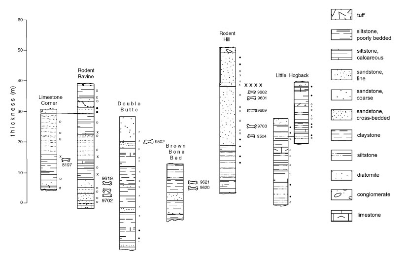 FIGURE 2. Stratigraphic section in the vicinity of Panaca that yielded vertebrate fossils (bone symbols). Sections are arranged according to the correlations in figure 7 of Lindsay et al. (2002). Note that we have not indicated any fossil site in the Little Hogback section, which is where we believe fossils were collected by Stock (1921). Small circles and X's to the right of the sections indicate magnetic polarity determinations (open circle = reversed polarity, closed circle = normal polarity, x = indeterminate polarity).