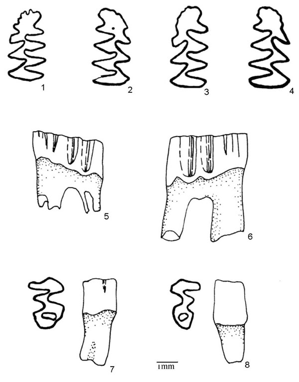 FIGURE 21. Nevadomys cf. N. fejfari n. gen and sp. from Locality 9620. 1-4: occlusal views of m1s, UALP 21947, 21940, 21944, and 21943. 5: labial view of 1(21947). 6: labial view of 2 (21940). 7-8: occlusal and anterior views of M3s, UALP 21921 and 21916.