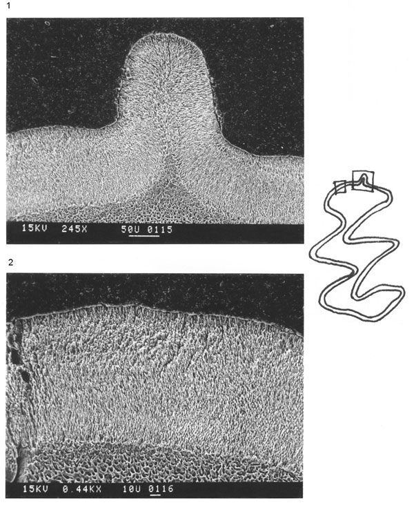 FIGURE 31. Schmelzmuster of Nevadomys downsi n. gen. and sp. on the trailing edge of the anterior lobe of M1. 1: the prism on the anterior lobe of a left M1 (21999) from Locality 9621, composed of radial enamel. 2: the trailing edge on the anterior lobe of the same tooth. A trace of primitive tangential enamel is present (top).