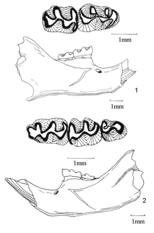 FIGURE 4. The lower molars of Peromyscus hagermanensis from the Panaca local fauna. 1: occlusal and labial views of UALP 22969, a right dentary fragment with m1-m2 from 9602. 2: occlusal and labial views of UALP 23015, a left dentary fragment with m1-.3 from Locality 9702.