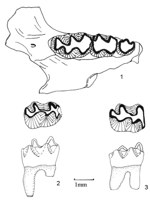 FIGURE 5. Onychomys from the Panaca local fauna. 1: occlusal view of a left maxillary fragment with M1-M3, UALP 22895 from Locality 9504. 2: occlusal and labial views of UALP 22957, a right m1 from Locality 9601. 3: occlusal and labial views of UALP 22927, a left m2 from Locality 9620.