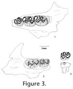 Discussion. Except for the schmelzmuster on the ACC, other characters are very similar to those of Nevadomys fejfari from the type locality. The schmelzmuster on the ACC of m1 from this population is more derived than that of N. fejfari and comparable to that of M. panacaensis. However, the schmelzmuster on the rest of the enamel bands is comparable to that of N. fejfari but more primitive than that of M. panacaensis. The characters of M3s in this population are distinctive from M. panacaensis in that M3s of N. fejfari have two roots and well-developed large posterior enamel islet.