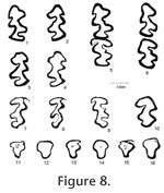 M3 is well reduced, and the occlusal outline changes dramatically at different wear stages. In unworn specimens, two labial reentrants are present so that the occlusal surface is E-shaped (Figure 7.9). The posterior reentrant is usually shallower than the anterior reentrant. Anterior cingulum is developed. The protocone is distinct, and the paracone is large. The hypocone is smaller than the protocone but is usually distinct until moderately worn; it is separated from the protocone by a shallow hypoflexus. The metacone is indistinct or absent. In slightly worn specimens, the hypocone and posterior cingulum are reduced, forming a rounded posterior heel. With wear, the posterior cingulum connects to the paracone closing the metaflexus to form a smaller and shallow posterior enamel islet (Figure 7.10-7.11). The enamel wall of this islet is very thin, unlike that of R. maxumi. Also with wear, the paracone may connect to the well-developed anterior cingulum to form a large and shallow anterior enamel islet that may persist until moderate wear (Figure 7.8). Alternatively (in 14% of the M3s, nine out of 65), the opposing enamel walls of the paraflexus never connect to form an islet, and the occlusal view results in an "F" shape (Figure 7.7). With greater wear the anterior and posterior islets are lost (Figure 7.12). The root condition of M3 is highly variable: most M3s have two roots (68%), some have only one root (24%), and a few retain three roots (8%;