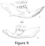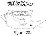 Moderately worn dentary UALP 21936 may represent an aberrant N. fejfari in that its mental foramen is situated on the labial side of the mandible, slightly lower than the apex of masseteric crest (Figure 22). This position is lower than the mental foramen of most specimens of N. fejfari, but a similar low position is also seen on specimens of Nevadomys n. sp. from Locality 9621 (UALP 22047 and 22048). The m1 on UALP 21936 has a posterior lobe, three alternating triangles, and an ACC. No enamel islet is present on the ACC. A "Mimomys kante" is well developed on the primary wing.