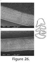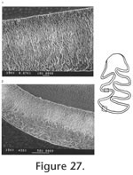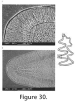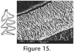 Two m1s and one M1 were examined under SEM for their schmelzmuster. The leading edge on ACC of two m1s is composed of radial enamel. A few prisms close to the dentine at the apices of the lobes on ACC may extend toward the occlusal surface, forming a trace of discrete lamellar enamel (Figure 30.1). The leading edges and trailing edges have the same pattern, and both are composed of two radial enamel bands. The inner layer is more compressed than the outer layer (Figure 30). Primitive tangential enamel is observed on the trailing edge of the posterior lobe of m1. No discrete lamellar enamel is seen on the apices of the alternating triangles.