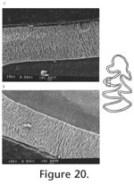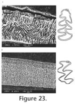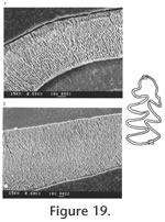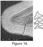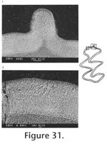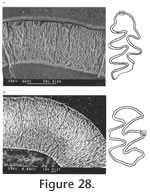 A moderately worn M1 (UALP 21999) with a distinct enamel "prism" on the anterior surface was chosen for examination. Traces of primitive tangential enamel are seen on the trailing edge of the anterior lobe, and the enamel "prism" on the anterior surface is composed totally of radial enamel (Figure 31).