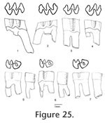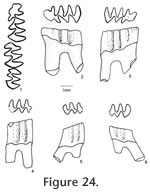 The m3 has a posterior lobe and four alternating triangles, with labial triangles distinctly smaller than lingual triangles. The degree of closure between the posterior lobe and Triangle 1 is slightly open or moderately open, open between Triangle 1 and Triangle 2, slightly or moderately open between Triangle 2 and Triangle 3, and open between Triangle 3 and Triangle 4. As in the m2s, thinner enamel is present on the anterior surface of slightly worn specimens (Figure 24.5). The posterior shelf is absent on m3.