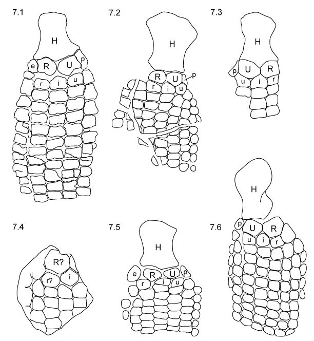 FIGURE 7. Comparison of forelimbs among different Platypterygius species. 7.1 DMNH 11843, left forelimb in dorsal view; 7.2 UALVP 45636, right forelimb in ventral view (modified from Maxwell and Caldwell 2006); 7.3 P. americanus, UW 2421, right forelimb in dorsal view (modified from McGowan 1972); 7.4 P. hauthali, MLP 79-I-30-2, position and view unknown (modified from Fernández and Aguirre-Urreta 2005); 7.5 P. hercynicus, left forelimb in dorsal view (modified from Maisch and Matzke 2000); 7.6 P. australis, QM F3348, right forelimb in dorsal view (modified from McGowan and Motani 2003). Abbreviations same as in Figure 4. Not to scale.