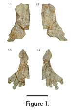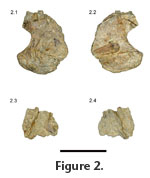Cranial Elements. The parietal is a rectangular shaped element anteriorly. Its sides diverge posteriorly to form the supratemporal process (Figure 1.1-1.2). The postfrontal is mostly complete (Figure 1.3-1.4). The anterior portion is dorsoventrally compressed and fan shaped with a crenulated margin. It is crescent shaped lateromedially, contributing to the lateral margin of the temporal fenestra. Posteriorly, the postfrontal is strut like and transversely compressed, forming a ridge on the ventral surface anteriorly. The quadrate is a concentric bone with a ventrally prominent articular condyle (Figure 2.1-2.2). The fragmentary frontal has a highly corrugated ventral surface (Figure 2.3-2.4).