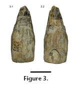 The teeth are stout, conical, and slightly curved (Figure 3.1-3.2). The enamel extends one-third to one-half of the total crown length. The enamel exhibits fine regularly spaced longitudinal ridges. Below the base of the crowns, the teeth bulge slightly and are subrectangular in cross-section with coarser longitudinal ridges. A single tooth is preserved within a fragment of maxilla. The tooth is set into a dental groove without ankylosis, indicating an aulacodont implantation.