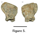 Humerus. The proximal end of the right humerus is crushed anteroposteriorly (Figure 5). The distal end preserves all four facets. The left humerus is a short and robust element that is wider (anteroposteriorly) distally than proximally with an un-constricted shaft (Figure 6). This difference in width is most likely due to deformation during burial. Crest-like dorsal and ventral trochanters are restricted to the proximal portion of the shaft and decrease in size distally. There are four distinct articular facets on the distal surface. The two larger middle facets articulate with the radius and ulna, with the radial facet being concave and smaller than the ulnar facet. The posterior facet is half as small as either the radial or ulnar facet and articulates with the pisiform element. The smaller anterior facet articulates with the extra zeugopodial element.