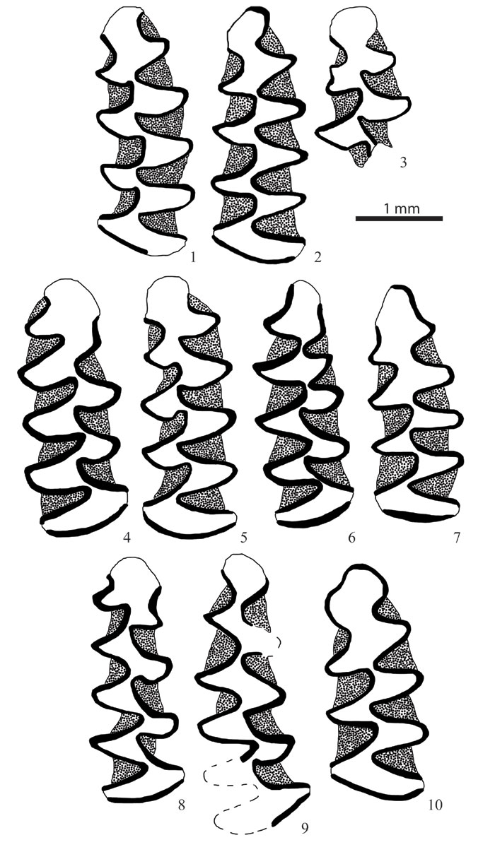 FIGURE 3. Occlusal view of lower first molars (m1) representing the different morphotypes observed in the Fiene Arvicolini sample. Left m1s (VP-15648, -15644, -15711) exhibiting morphotypes A-C respectively of Microtus sp. (1, 2, 3). Right m1 (VP-15636), left m1 (VP-15674), and right m1 (VP-15634) exhibiting morphotypes A-C respectively of Microtus paroperarius (4-6). Left m1 (VP-13797) of Microtus llanensis (7). Right m1s (VP-15692 and -15750) of Microtus meadensis (8 and 9). Note the presence of 'secondary wings' on VP-15750. Left m1 (VP-15712) of Allophaiomys (10).