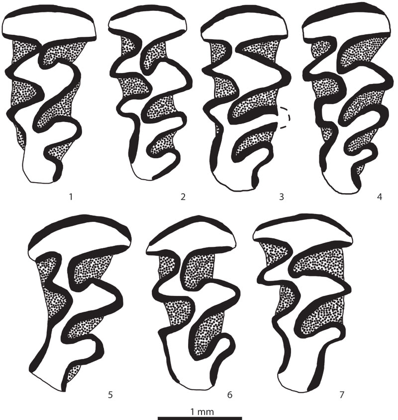 FIGURE 4. Occlusal view of upper third molars (M3) representing the different morphotypes observed in the Fiene Arvicolini sample. Right M3 (VP-15778) (1). Right M3 (VP-15790) (2). Right M3 (VP-15781) (3). Right M3 (VP-15784) (4). Right M3 (VP-15804) (5). Right M3 (VP-15820) (6). Right M3 (VP-1508) (7).