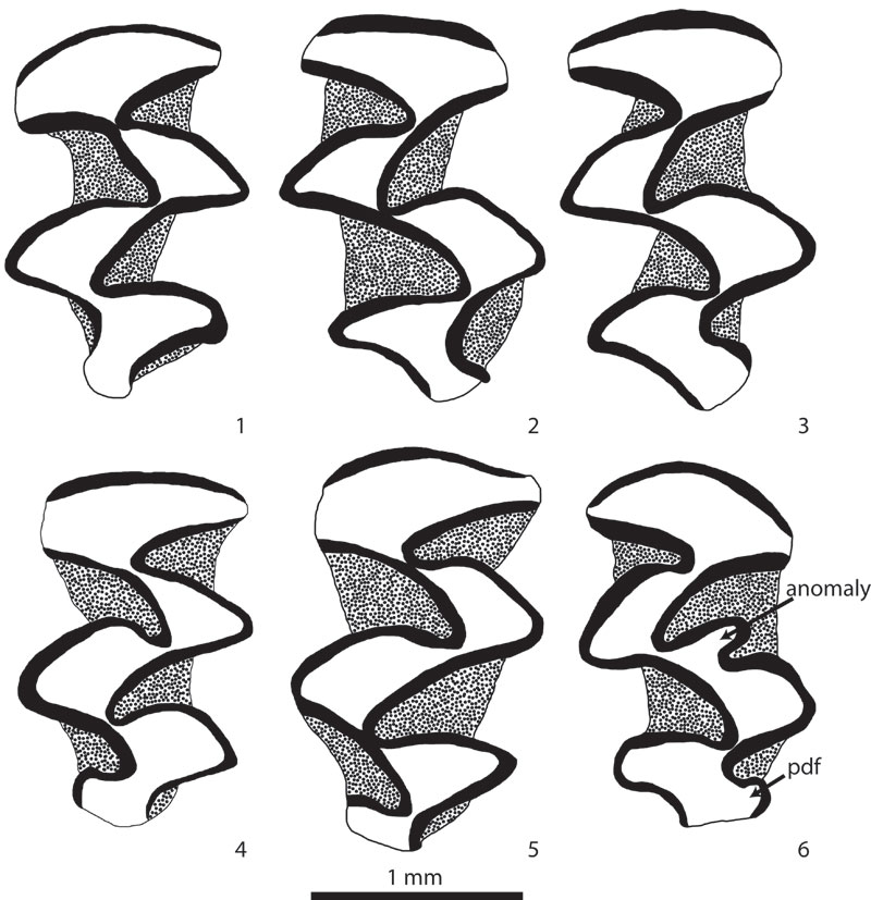 FIGURE 5. Occlusal view of upper second molars (M2) representing the different morphotypes observed in the Fiene Arvicolini sample. Left M2 (VP-13799) exhibiting 'Normal' condition (1). Right M2 (VP-16948) exhibiting incipient posterolingual dentine field (pdf; 2). Right M2 (VP-16953) exhibiting intermediate pdf (3). Left M2 (VP-13794) exhibiting well-developed pdf (4). Left M2 (VP-16911) exhibiting closed pdf (5). Right M2 (VP-16958) exhibiting an intermediate pdf and an anomalous dentine field on T2 (6).