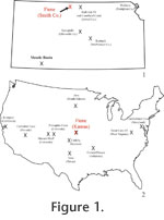 Other sites in Kansas, outside the Meade Basin, from which at least one of the taxa found at Fiene include Hall Ash Pit (Microtus sp., M. paroperarius) and Courtland Canal (Allophaiomys sp.) in Jewell Co., Kanopolis (M. llanensis) in Ellsworth Co., Kentuck (Allophaiomys sp.) in McPherson Co., and Wathena (Allophaiomys sp.) in Doniphan Co. (Figure 1.1). Other non-Kansas sites mentioned in this study (Figure 1.2) include Irvington (California), Java (South Dakota), Vera (Texas), Conard Fissure (Arkansas), Trout Cave #2 (West Virginia), and Cumberland Cave (Maryland).
