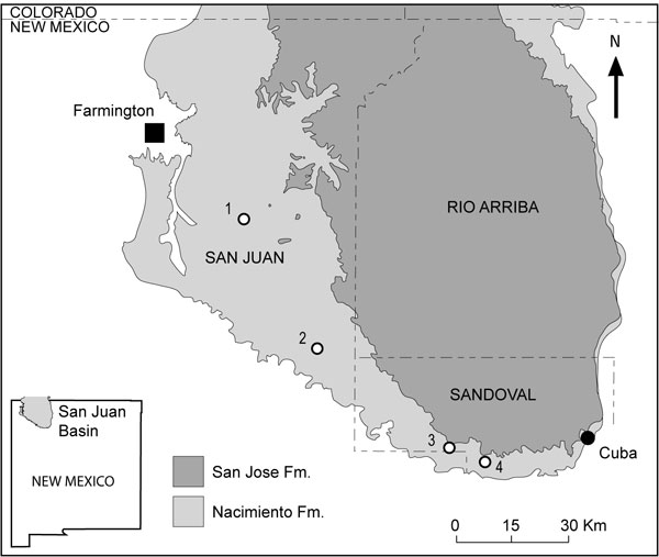 FIGURE 1. Map of the San Juan Basin, northwestern New Mexico showing the location of fossil localities yielding Torrejonian marsupial specimens documented here. A, NMMNH locality L-6398; B, L-5652; C, L-312, 1287, and 6898; D, L-1486, 2685, 6261, and 7583.