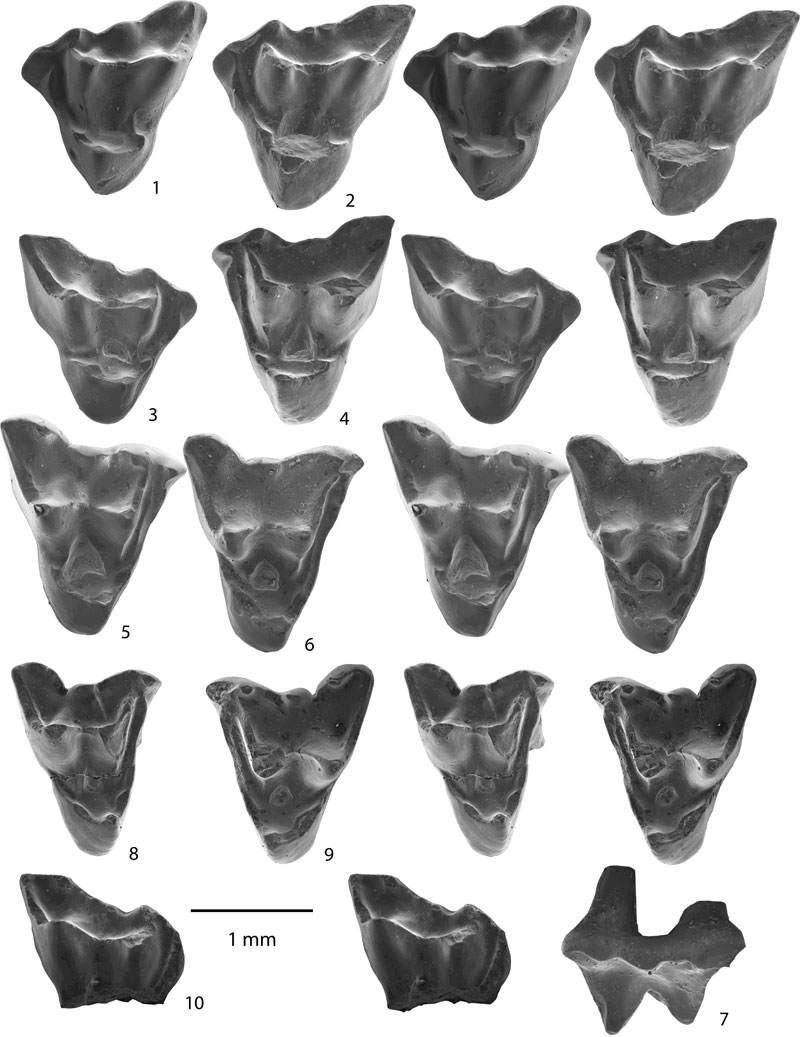 FIGURE 6. Upper dentition of Peradectes coprexeches sp. nov. NMMNH P-59015, left M1 in occlusal view (1; stereopair); 59063, left M1 in occlusal view (2; stereopair); 59508, right M1 in occlusal view (3; stereopair); 59319, left M2 in occlusal view (4, stereopair); 59509, right M2 in occlusal view (5, stereopair); 59512 (holotype), right M3 in occlusal (6; stereopair) and buccal (7) views; 57819 right M3 in occlusal view (8, stereopair); 59062, left M3 in occlusal view (9, stereopair); 59458, partial left M4 in occlusal view (10, stereopair).