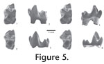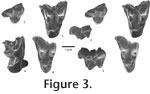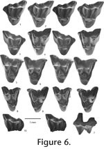 For all lower molars, the protoconid is larger than the metaconid, and the paraconid is the smallest trigonid cusp. The metaconid is mesial and slightly posterior to the protoconid. A distinct notch is present in the paracristid. The paracristid projects mesiolingually and terminates in a mesiolingual paraconid. The trigonid basin opens lingually as a groove between the metaconid and paraconid. A precingulid is present near the base of the tooth mesial and labial to the protoconid. The m1 trigonid is narrower than the talonid, and the paraconid and paracristid project more mesially than in the succeeding molars. For the m2 of NMMNH P-52885, the talonid is wider than the trigonid. The identity of many isolated teeth, whether they represent m2 or m3, remains uncertain. For m1-3, the trigonids and talonids are subequal in length (Figure 5.1-5.3.). The hypoconid is the largest of the talonid cusps. The hypoconulid and entoconid are positioned close together so that they are twinned. The entoconid is mesiodistally elongate and erect forming a blade that closes the talonid basin lingually. It is taller than the hypoconulid. The hypoconulid is distobuccal to the entoconid and inclined distally. The cristid oblique meets the distal face of the talonid near the distal base of the protoconid. The postcingulid descends from the buccal side of the hypoconulid to the base of the tooth distal to the hypoconid.