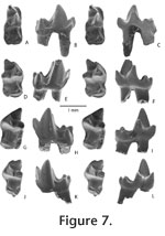 m2-3 (Figure 7.4-7.9) differs from m1 in having relatively shorter and wider trigonids with a paraconid that is positioned near the mesiolingual corner of the tooth. The entoconid is relatively lower and shorter so that it is subequal in size to the hypoconulid or smaller. It is conular rather than buccolingually compressed.