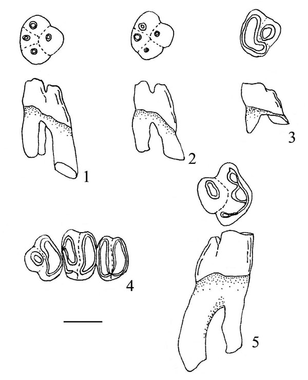 FIGURE 11. Upper cheek teeth of Perognathus mclaughlini and Oregonomys sp. from the Panaca local fauna. 11.1-11.3, occlusal and lingual views of P4s, UALP 23037, 23038, and 21285. 11.4, occlusal view of a left P4-M2, UALP 23093. 11.5, Oregonomys sp., occlusal and lingual view of a left P4, UALP 23064. The scale bar is 1 mm.