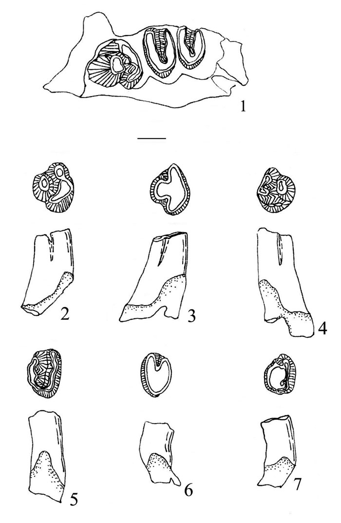 FIGURE 15. Upper cheek teeth of Prodipodomys tiheni from the Panaca local fauna. 15.1, occlusal view of a left maxillary with P4-M2, UALP 23153. 15.2-15.4, occlusal and lingual views of P4s, UALP 23223, 23201, 23154. 15.5, a right M1, UALP 23157. 15.6, a left M2, UALP 23137. 15.7, a right M3, 23161. The scale bar is 1 mm.