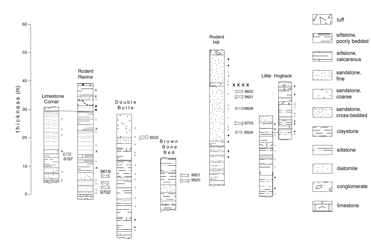 FIGURE 2. Stratigraphic section in the vicinity of Panaca that have yielded vertebrate fossils (bone symbols). Sections are arranged according to the correlations in figure 7 of Lindsay et al. (2002). Note that we have not indicated any fossil site in the Little Hogback section, which is where we believe fossils were collected by Stock (1921). Small circles and X's to the right of the sections indicate magnetic polarity determinations (open circle = reversed polarity, closed circle = normal polarity, x = indeterminate polarity).