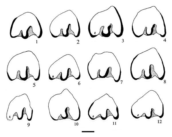 FIGURE 6. Enamel patterns of the occlusal surface of p3s of Hypolagus edensis and H. tedfordi. The letter "R" indicates a right p3 and the drawing was reversed. 6.1-6.8, Hypolagus edensis, UALP 21519, 22147, 22146, 22177, 22222, 22230, 22335, and 22342. 6.9, Hypolagus cf. H. edensis, UALP 22343. 10-12, Hypolagus tedfordi, UALP 22393, 33340, 22188. The scale bar equals 1 mm.
