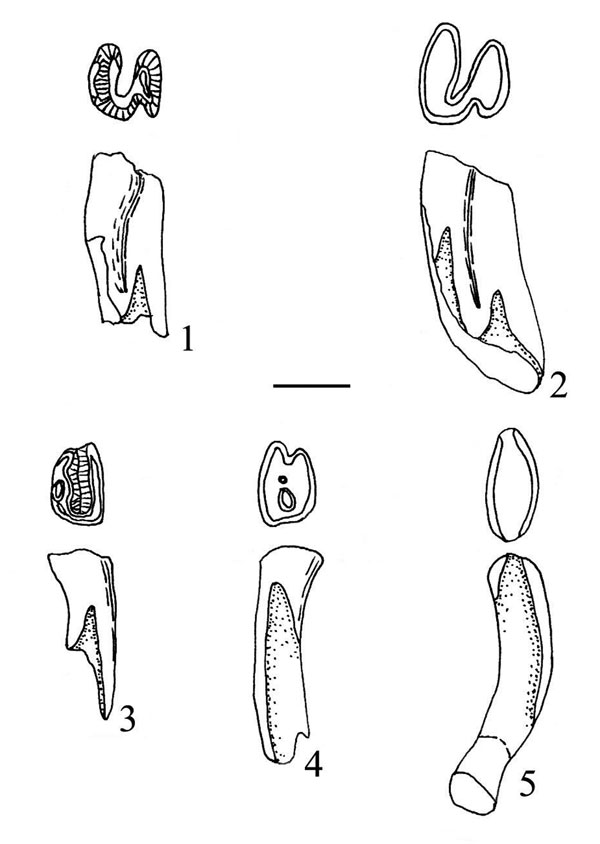 FIGURE 9. Upper cheek teeth of Pliogeomys parvus from the Panaca local fauna. 9.1-9.2, occlusal and lingual views of P4s, UALP 21566, 21567. 9.3, a right M1, UALP 21572. 9.4-9.5, M2s, UALP 21586, 23267. The scale bar is 1 mm.