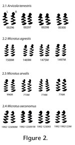 two out of 28 (7.1%) teeth did not match to their contralateral counterpart; in Microtus agrestis 15 out of 24 (62.5%) did not match; in M. arvalis 20 out of 38 (52.6%) were mismatched; and in M. oeconomus