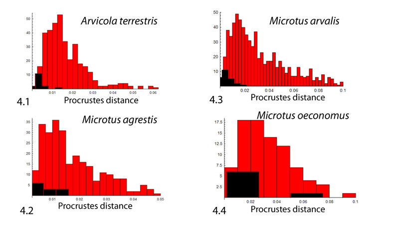 FIGURE 5. Histograms of Procrustes distances between teeth from the same individual (black bars) and between teeth from different individuals (red bars). While the largest differences are between teeth from different individuals, the distribution of distances between sides overlaps with distances between individuals in all four species.