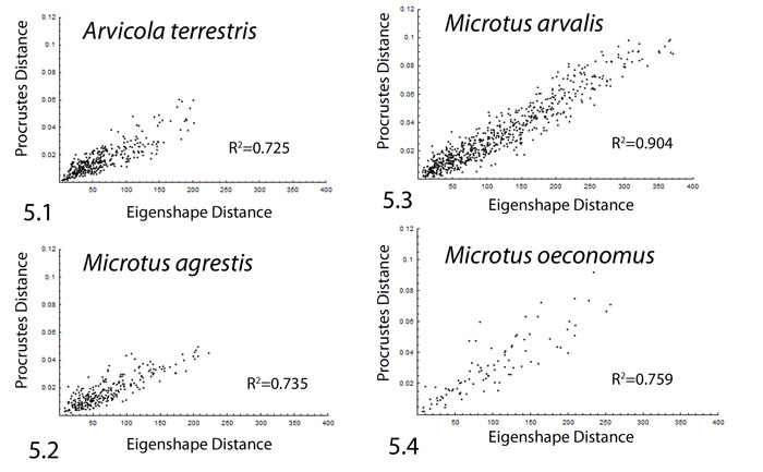 FIGURE 6. Comparison between Eigenshape and semilandmark (Procrustes) analysis. For each of the four species a scatterplot shows the relationship between the morphometric distance between pairs of teeth calculated using Eigenshape (y-axis) and Procrustes superimposition of semilandmarks (x-axis). R2 is the proportion of variance in Procrustes distance that is explained by Eigenshape distance.