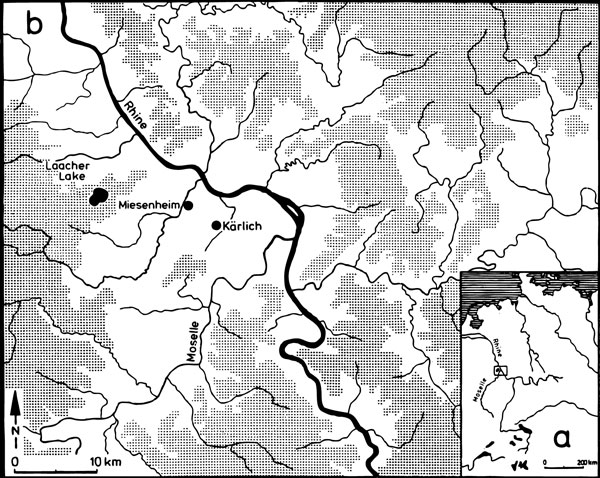 FIGURE 1. Map with the geographical position of the Kärlich (Neuwied Basin, Germany) locality. 1a. Location of the Neuwied Basin in Europe; 1b. Location of the site Kärlich in the Middle Rhine area (Germany).