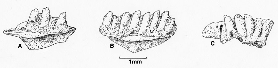 FIGURE 5. Three maxilla fragments [A: (FdA-KäG nr. 8009); B: (FdA-KäG nr. 8011); C: (FdA-KäG nr. 8013)] (lingual view) of Lacerta sp. (large species) from Kä G. The scale line refers to all three figures.