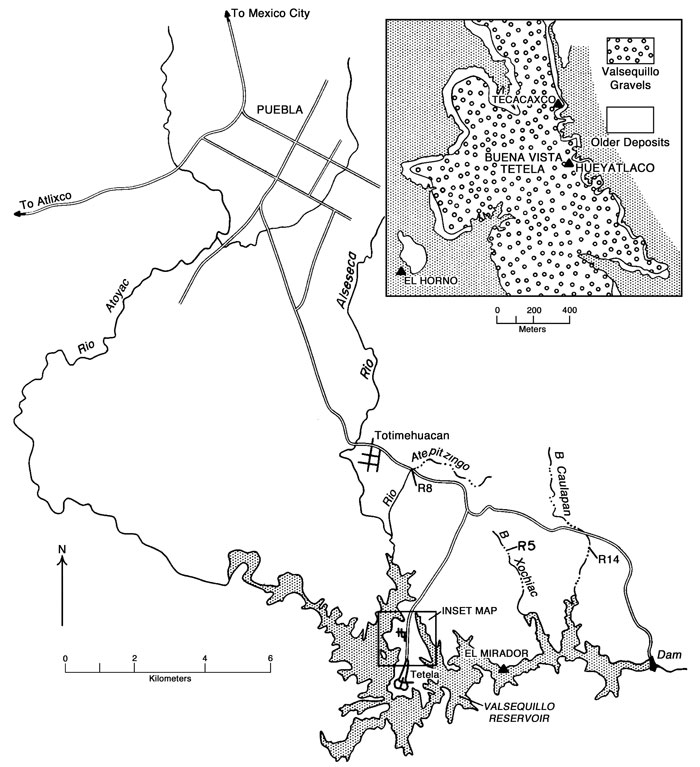 FIGURE 1. Index map of the Valsequillo area showing the archaeologic sites El Horno (2040 m), El Mirador (2049 m), Tecacaxco (2055 m), and Hueyatlaco (2056 m).