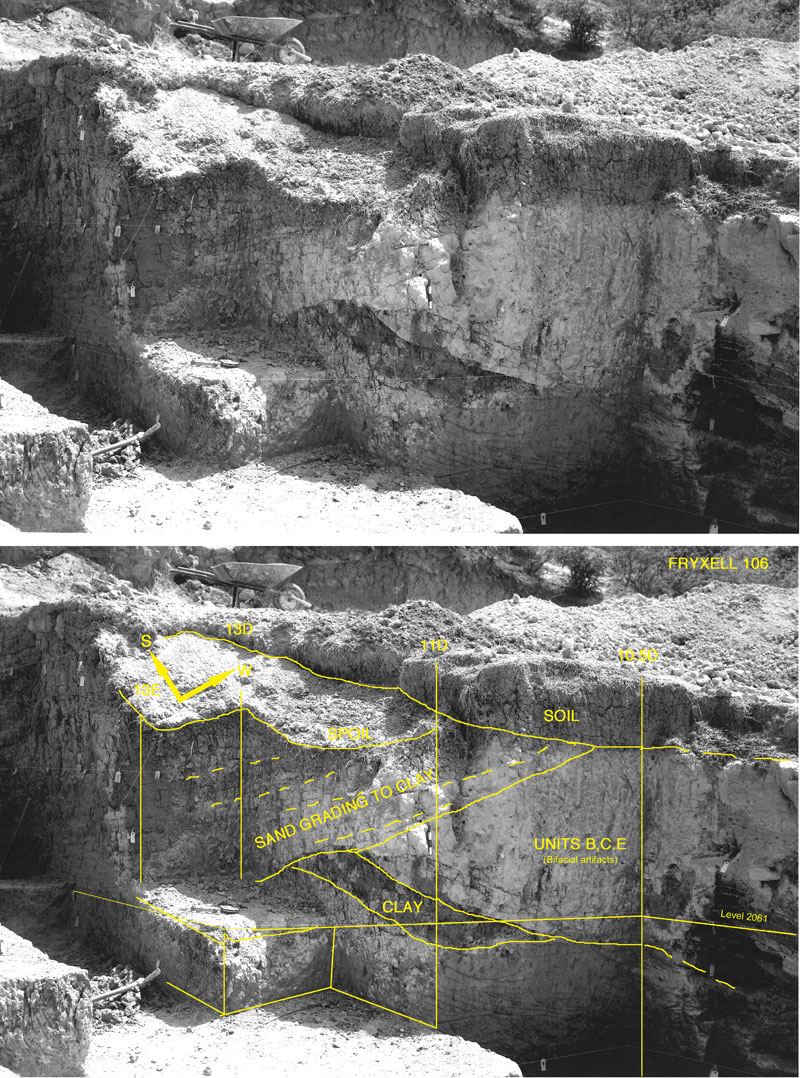 FIGURE 15. Fryxell photo 106, showing the 1973 trench from 13E to 9.5B. Level 2061 is marked by a string just below the middle. Above a dark lenticular layer of clay at the center and extending to the right are channel deposits designated as Units B, C, and E by Irwin-Williams (1967a), which yielded bifacial artifacts. These are steeply overlain at the center and to the left by southward dipping sandy beds. Because these beds flatten to the south and become clayey, they were described as "Sand grading laterally to clay" (Steen-McIntyre et al., 1981).
