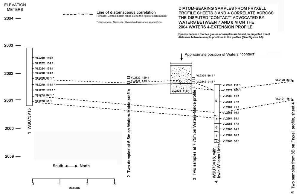 FIGURE 16. Chart showing diatom-bearing samples plotted on Fryxell Profile Sheets 3 and 4 (1973) and the 4-Extension Trench profile, which correlate across the disputed "contact" advocated by M. Waters.