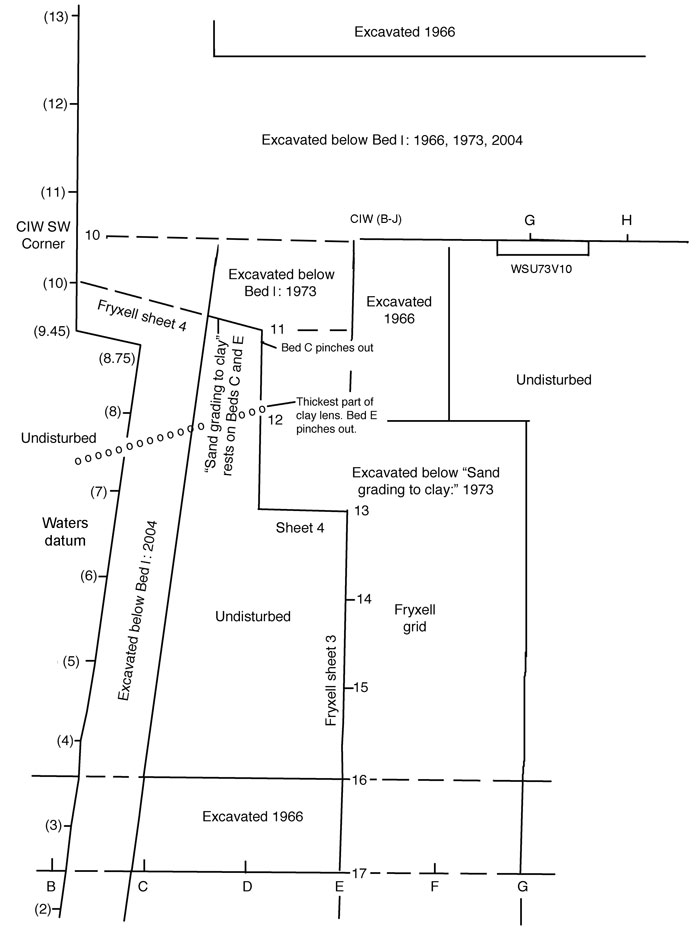 FIGURE 18. Map of the western part of the area excavated in 1966 and the northern part of the area excavated in 1973 and 2004. Grid marks for 1973 were established by Roald Fryxell, and those for 2004 were used by Michael Waters.