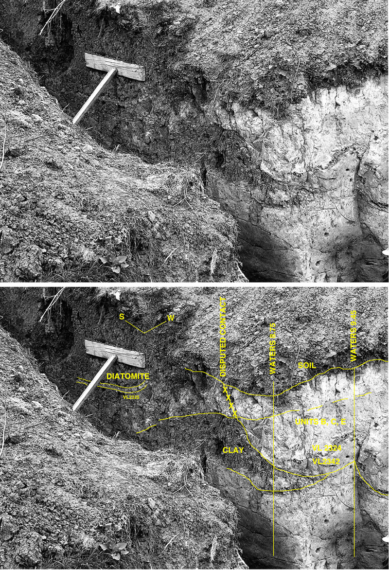 FIGURE 20. Malde photo taken June 4, 2004, showing the area of the disputed contact in the Waters 4-Extension Trench. The board on the right side of the trench is 0.8 m long.