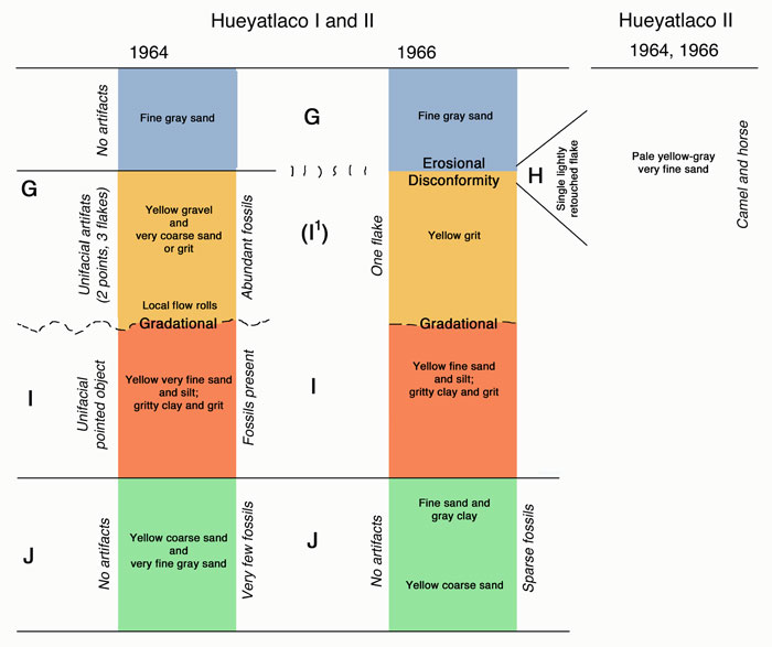 FIGURE 4. Chart compiled from the Irwin-Williams open file INAH reports (1964, 1966), showing her changes in names for deposits G through J, and her assignments of artifacts and fossils.
