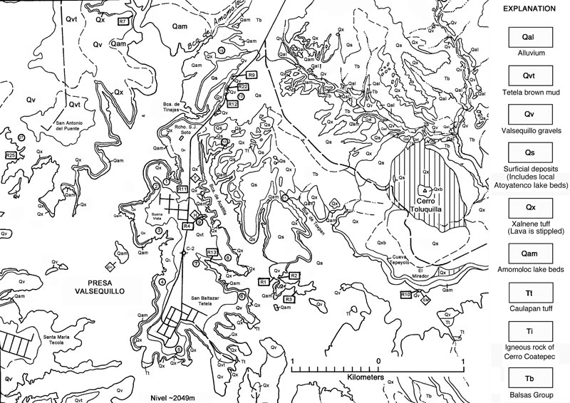 FIGURE 6. Geologic map of the Tetela Peninsula area, Valsequillo, Mexico, completed by Harold E. Malde, 1964-1966.