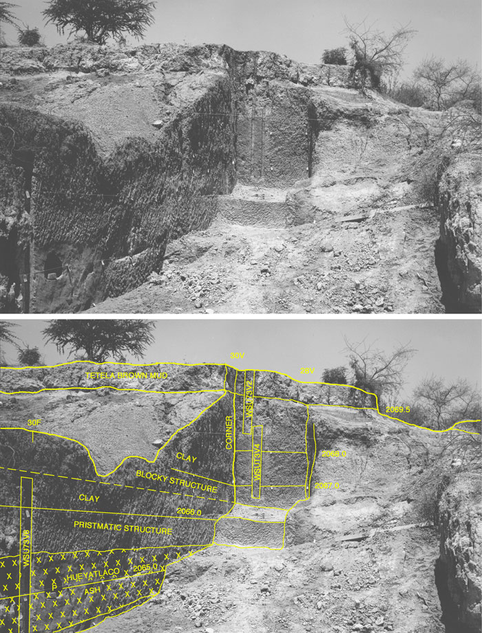 FIGURE 8. Fryxell photo 315, showing Hueyatlaco ash overlain by Tetela brown mud 4 m higher at 1973 grid points 28V to 30F.