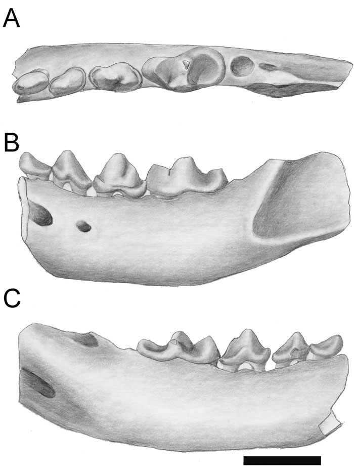 FIGURE 1. Cernictis repenningi, sp. nov. UALP 8079, left mandible with p2-m1. A, dorsal; B, external; and C, internal views. Scale equals 10 mm.